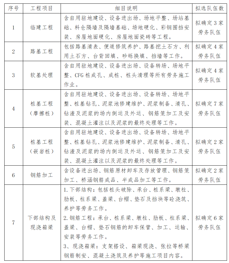 临建工程、路基工程、软基工程、桩基工程(摩擦桩)、桩基工程(嵌岩桩)、钢筋加工、桥梁下部结构及现浇箱梁等招标内容