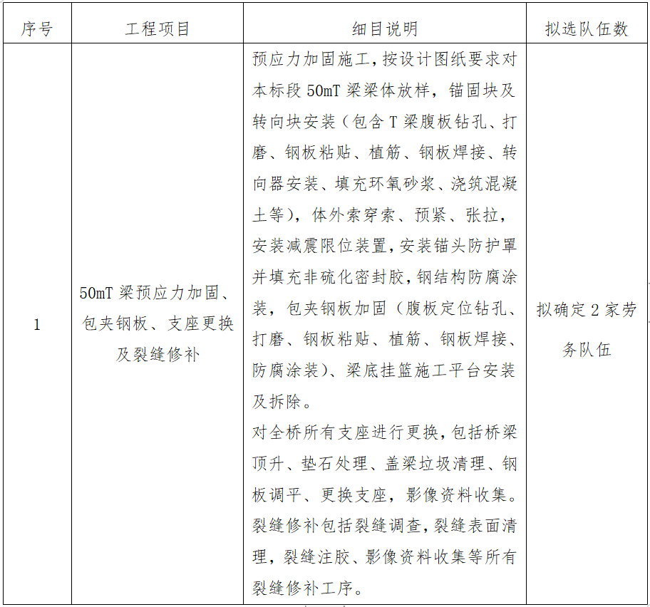 我公司已中标开封市S213线开封黄河公路大桥改造工程一标段项目,项目部驻地建设已经完成,项目部管理机构已成立,图纸已到位,已具备了开工条件。为优质、快速、高效地完成本合同段的施工任务,现对50mT梁体外预应力加固、包夹钢板、支座更换及裂缝修补劳务分包进行公开招标。